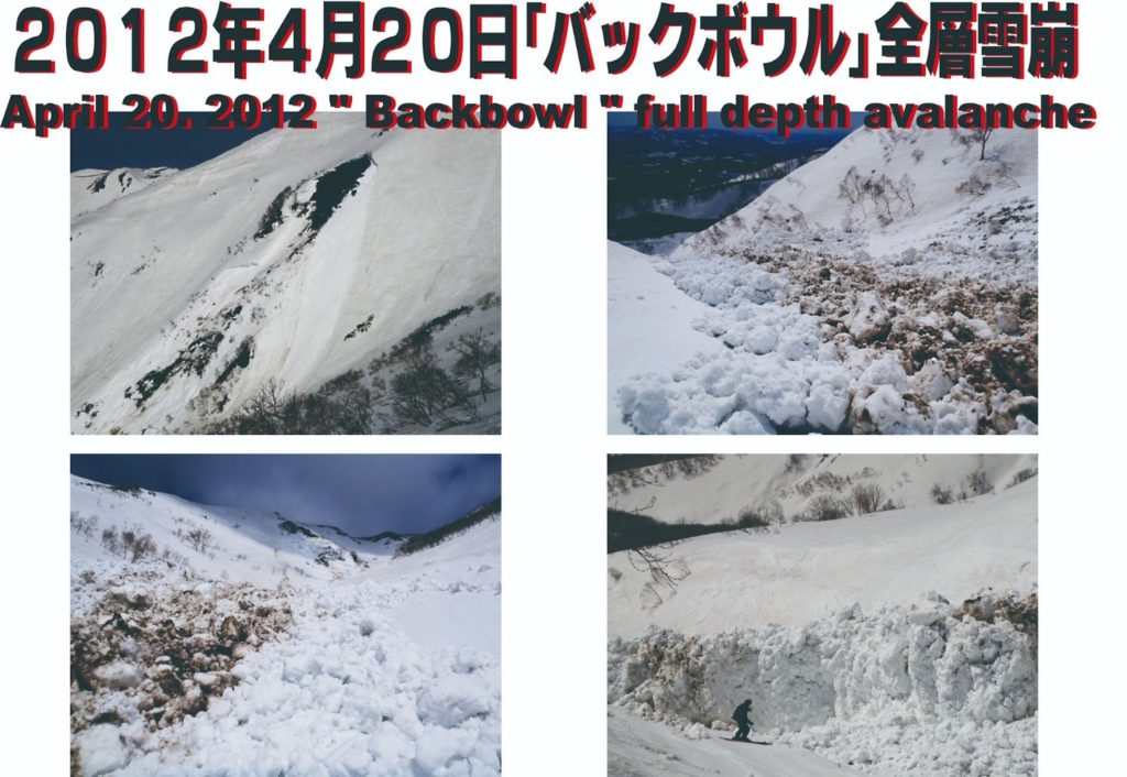 山麓ヒラフ方面の融雪が進み連絡通路で通行不可箇所が出ている。規制された場所を通ってはならない。法面からの雪崩の危険がある。南面では規模の大きな全層雪崩が起こり始めている。立ち入り禁止区域湯の沢を山麓へのお帰りコースとして使ってはならない。午後にかけて側壁からの雪崩の危険が高まる。濃霧のためゲート開閉は未定、パトロールの指示に従うこと。5番花園ゲートは開けられる。雪庇崩壊の危険を避けるためハイトラバースして奥に入らないこと。真似る人が出て事故発生の確率を高める。この情報もそろそろ終わる。今日は2012年春の写真を貼り付ける。雪崩の危険を軽視してはならない。用心だけが事故を防ぐ。